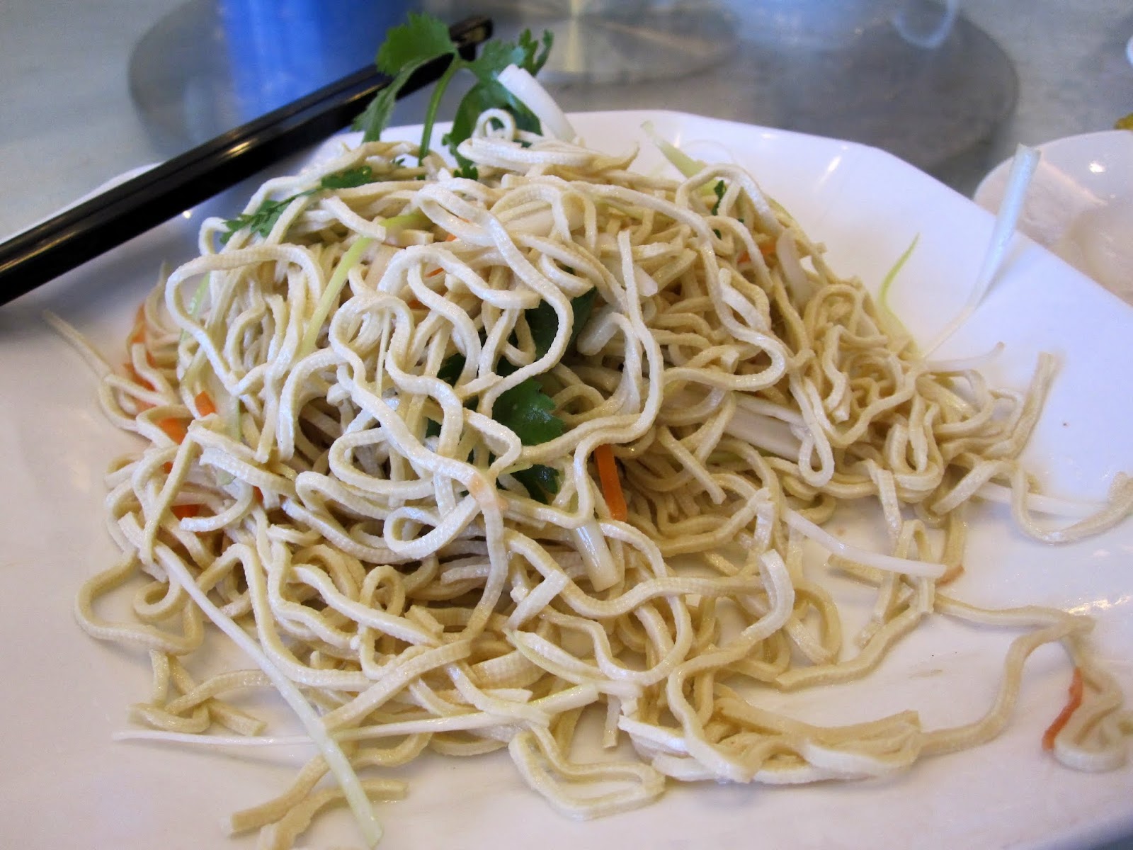 The restaurant is a decent size, but like most Chinese dim sum places, they don't offer too much space between tables. The decor is relatively clean and simple, but they definitely tried to add in some character with the nicer chair covers, chandeliers, and faux coconut trees.Tofu Noodes